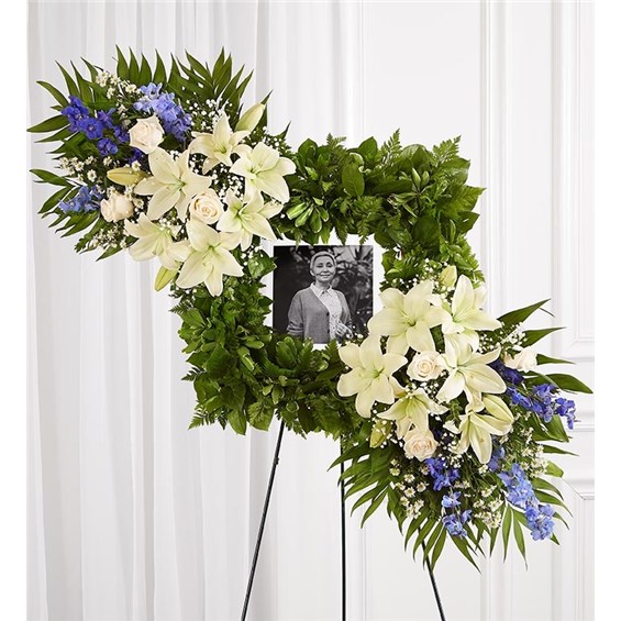 Celebrate the cherished memories you shared with a beautiful floral arrangement. Our unique design features a square wreath of greenery—perfect for displaying a photo—and two sprays on each end gathered with soothing blue & white blooms for a lush, full presentation. It’s a special tribute to honor the life of a loved one. Standing spray arrangement features a stylized 18" square wreath with assorted greenery covering the base and two floral sprays at opposite ends gathered with white roses, and Asiatic lilies and monte casino, blue delphinium; accented with baby’s breath and soft, lush greenery Measures approximately 38"H x 40"W without stand Arrives on an easel; measures 66"H Appropriate for the funeral home or gravesite Our florists hand-design each arrangement, so colors and varieties may vary due to local availability To ensure lasting beauty, Asiatic lilies may arrive in bud form and will fully bloom over the next few days